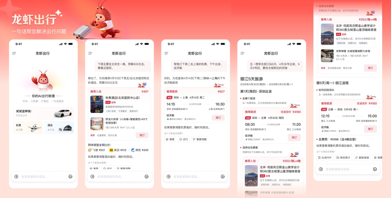 基于“Sage”多智能体协作平台,“龙虾出行”推出针对出行行业垂直领域的Skills,用户可一键配置安装。“龙虾出行”Skills与产品展现出三大核心优势:一是省钱省心,全网比价、全网最低。除了实现“一句话”打车、订机票、订酒店之外,为用户挑选最具性价比的出行服务,大幅降低出行的成本;二是智能匹配,基于用户历史偏好、实时路况、运力分布等多维数据,精准推荐最优服务供应商,让出行更智能;三是全链路自动化,从预约、行程管理到费用结算,全程无需人工干预,真正解放用户双手。