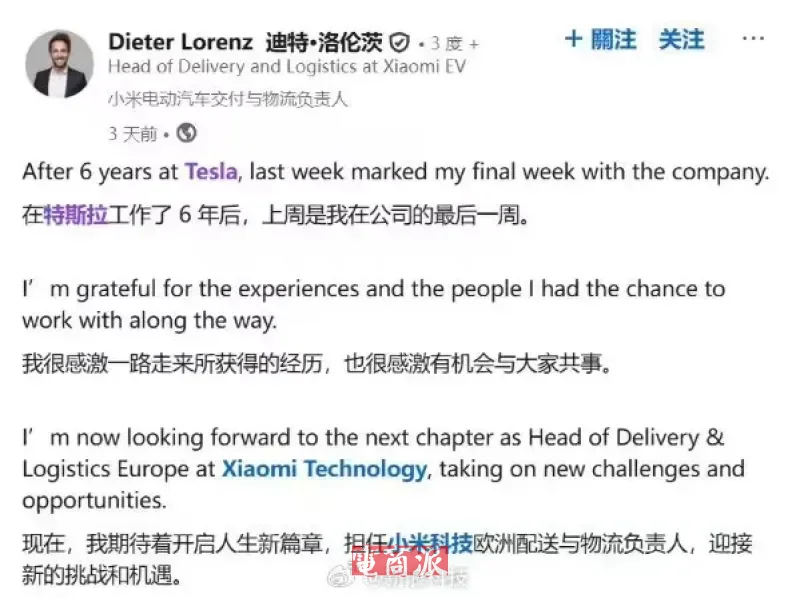 人才布局方面,小米也已发力,近期聘请了前特斯拉中欧地区交付运营高级经理迪特洛伦茨,出任欧洲交付与物流负责人,为小米汽车出海夯实人才基础。