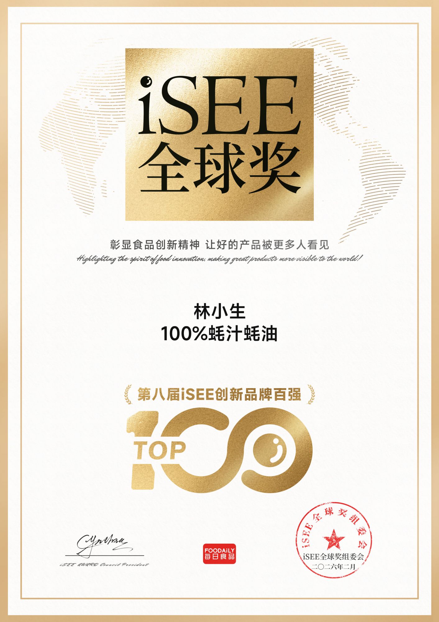 4月15日-17日,第八届iSEE全球奖颁奖盛典在中国无锡举行,正式揭晓年度终极获奖名单。本届评选共吸引了全球5688个品牌案例参与角逐。健康调味品牌林小生携其标杆产品“100%蚝汁蚝油”再度入选,连续第三年斩获iSEE“创新品牌百强”荣誉。该榜单覆盖休闲零食、乳制品、茶饮、调味料等多个赛道,一同入选的还有伊利、三全食品、乐事、奥利奥等知名品牌。