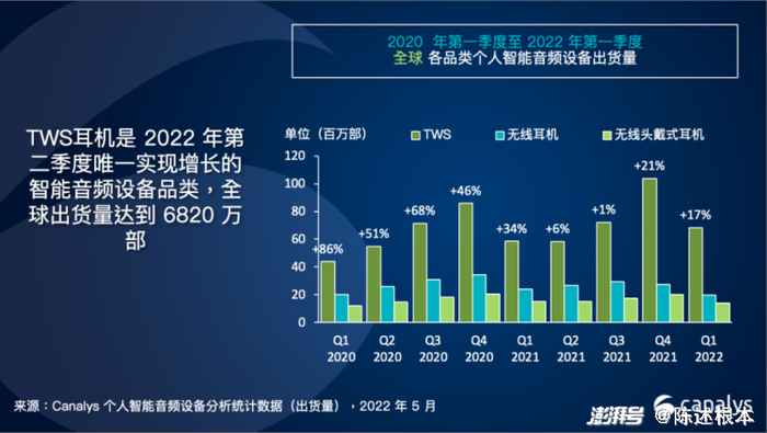 近日,根据统计机构Canalys发布的数据来看,2022年第一季度全球真无线耳机(TWS)市场增长了17%,达到6820万部,其中苹果、小米、三星位于品牌销量前三,音频厂商Skullcandy和Edifier进入前五。