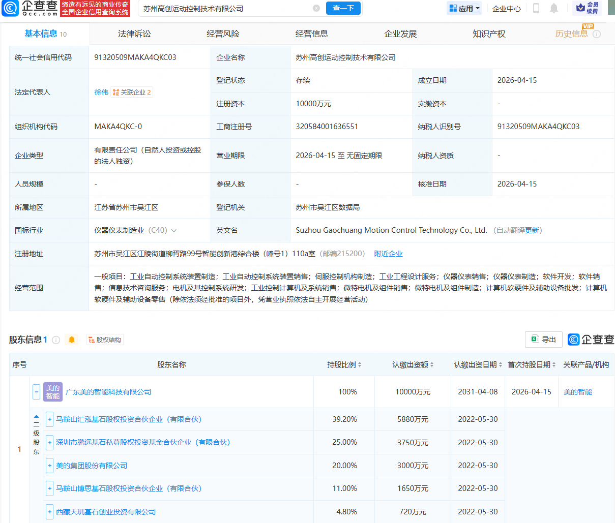 数据显示,近日,苏州高创运动控制技术有限公司成立,法定代表人为徐伟,注册资本为1亿元,经营范围包含:工业自动控制系统装置制造;伺服控制机构制造;工业工程设计服务;仪器仪表销售等。股权穿透显示,该公司由广东美的智能科技有限公司全资持股,后者由美的集团(000333.SZ)、深圳市鹏远基石私募股权投资基金合伙企业(有限合伙)等共同持股。