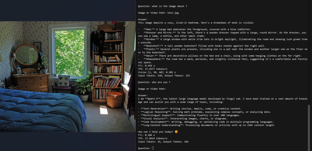 模型能够对输入图片进行详细的场景描述(床、梳妆台、书架、植物、装饰等元素的精准识别),并在纯文本模式下流畅对话,展现出优秀的多模态理解能力。应用场景