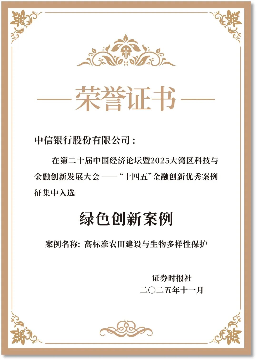 中信银行将生物多样性保护审核纳入授信业务,嵌入贷前、贷中、贷后全过程管理,创新落地以生物多样性相关的收益权质押,既开辟了新的业务领域与市场空间,也为农业绿色转型提供了有力支撑。目前,其“高标准农田建设与生物多样性保护”项目已投放2.2亿元,累计促进整治新建类高标准农田1.5万亩,覆盖农户2965户,助力当地实现创收25亿元,有效促进区域农业绿色发展和生态环境改善。