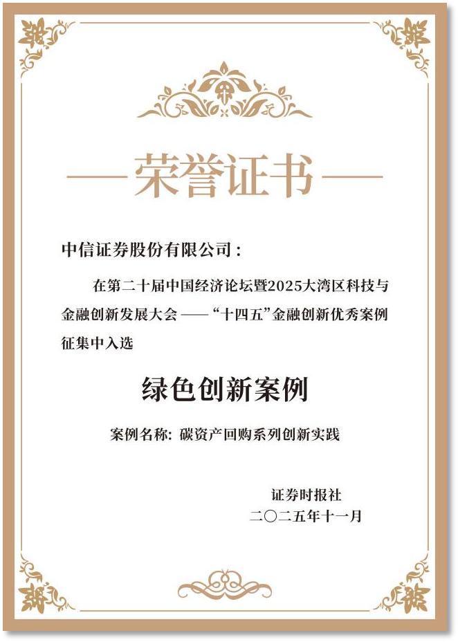 依托集团碳技术及碳咨询能力,在中信金控“五位一体”绿色金融服务体系支撑下,中信证券聚焦绿色融资、绿色投资、绿色咨询、绿色生活、碳管理,为减排企业提供碳交易综合服务,助其降低履约成本、获取降碳资金及碳减排收益。