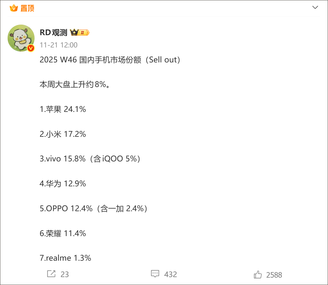 近日,数码博主@RD 观测发布的2025年 W46(11月10日至11月16日)国内手机市场份额数据显示,本周整体市场规模环比上升约8%,苹果以24.1%的份额维持榜首,小米以17.2%紧随其后,vivo以15.8%位列第三,华为、OPPO分居第四第五。