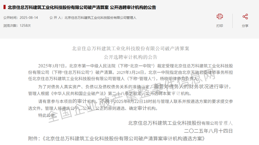 北京一中院裁定,北京住总万科建筑工业化科技股份有限公司(以下简称“住总万科建筑”),经法院强制执行后仍无法清偿债务,对其启动破产清算程序。成为近年来,万科系第一家破产公司。