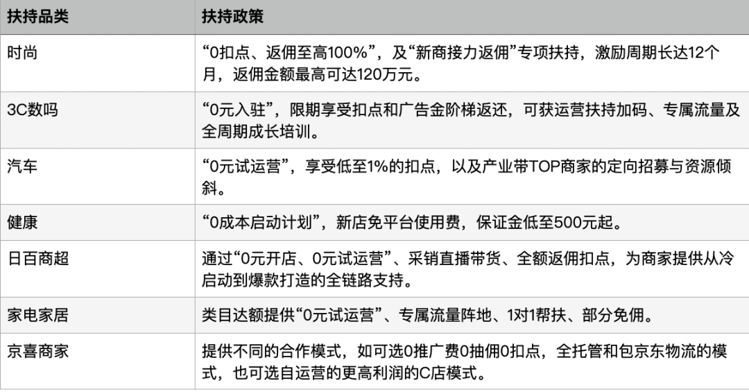 京东针对不同品类商家的扶持政策