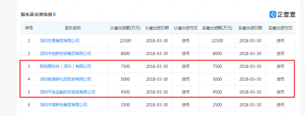 深圳联交所官网在披露公司的“控股股东”栏目下,将财纳易科技(深圳)有限公司、深圳前海联礼阳投资有限责任公司、深圳平安金融科技咨询有限公司三位股东均标明了“中国平安”的标识。