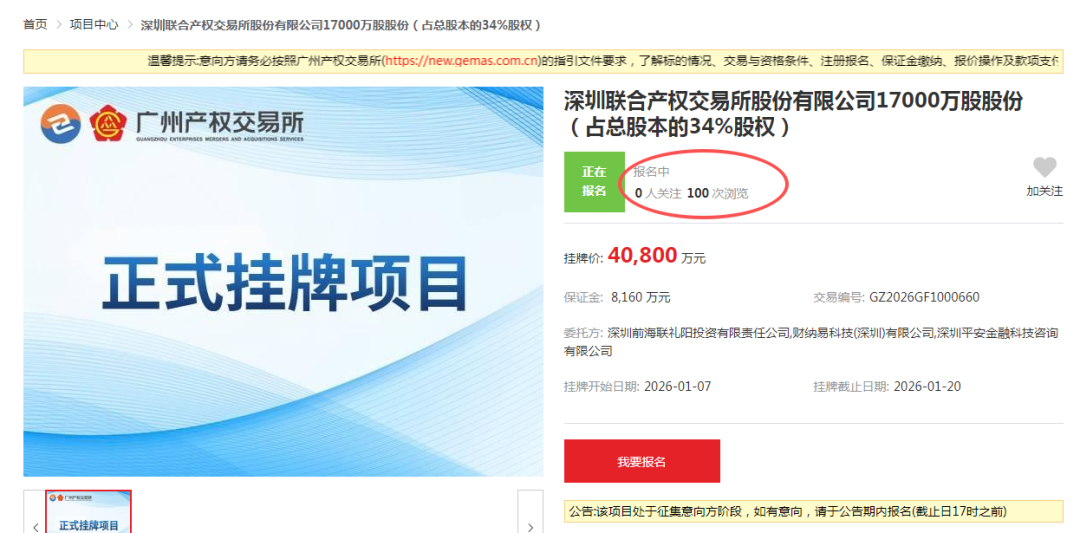上证报记者在查阅广州产权交易所挂牌项目时了解到,“深圳联合产权交易所股份有限公司17000万股股份(占总股本的34%股权)”于2026年1月7日挂牌,挂牌价为4.08亿元,保证金为8160万元,挂牌时间为10个工作日。