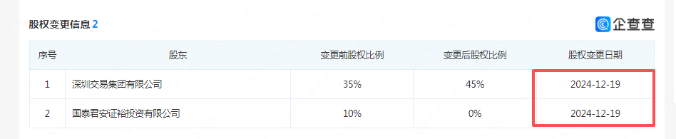 当年底,深圳交易集团有限公司将该10%股份收入囊中,持股比例由35%提升至目前的45%。