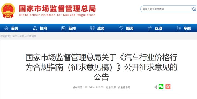 国家市场监督管理总局发布的《汽车行业价格行为合规指南(征求意见稿)》公开征求意见公告