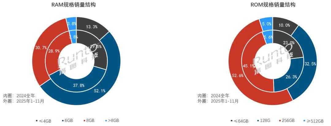 2025年中国学习平板线上市场RAM/ROM销量占比及变化数据来源:洛图科技(RUNTO)线上数据,单位:%