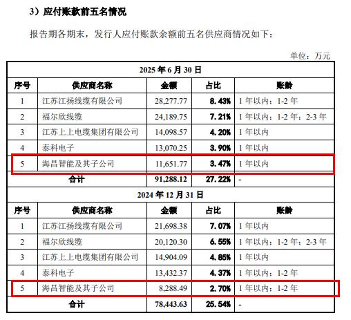 更值得注意的是,两家公司均处于产业链上下游,天海电子是海昌智能的第一大客户,同时海昌智能又是天海电子应付账款中的前五名供应商之一。2024年度,海昌智能设备及其备件占对天海电子销售收入的84.38%,模具及其备件占12.40%。截至2025年6月末,天海电子应付海昌智能账款从2024年末的8288.49万元上升至11621.77万元。天海电子在招股书中解释称,海昌智能是国内少数能够为汽车线束厂家提供高性能线束设备和模具的制造商,能满足天海电子生产设备的部分采购需求。公司线束生产设备定制化程度较高,海昌智能自设立以来从事相关设备、模具的研发生产,与公司建立了长期稳定的合作关系,深刻理解公司生产工艺,快速响应公司需求,能满足公司对于产品质量稳定性和生产连贯性要求。