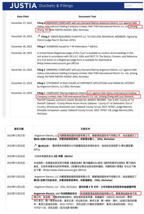 更严重的是,2023年12月,Angstrom Electric, LLC在美国密歇根州东区联邦地区法院提起诉讼,将鹤壁海投国际、天海电子核心子公司及原董事长列为被告,指控在Tianhai Electric North America(TENA)资产出售过程中被告方未披露真实财务状况,违反资产购买协议中的声明与保证条款。