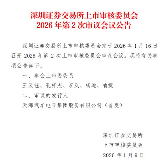 1月16日,深交所将召开本年度第二次上市审核委员会审议会议,会议聚焦天海汽车电子集团股份有限公司的深交所主板首发上市申请。