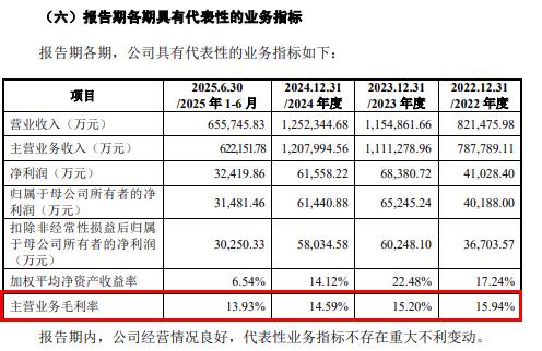 招股书显示,2022年至2024年天海电子营收、归母净利润虽呈增长态势,但主营业务毛利率已连续三年下滑,2025年上半年更是跌破14%关口。