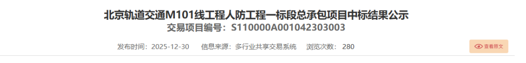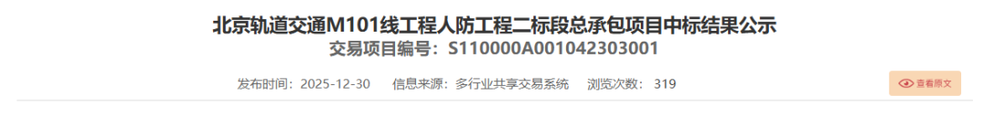 相关网站还发布了“北京轨道交通M101线工程人防工程一标段和二标段总承包项目”的中标结果公示。