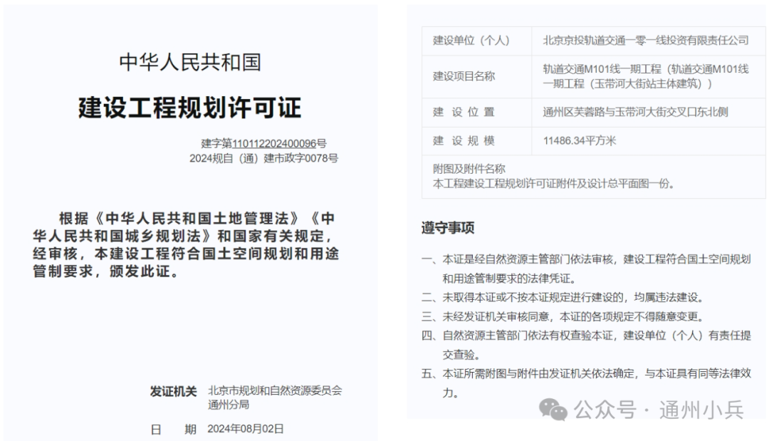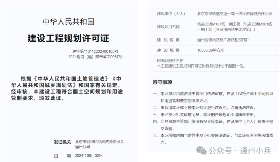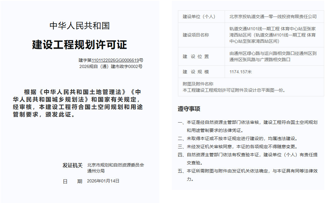 日前,市规自委还发布了“轨道交通M101线一期工程体育中心站至张家湾西站区间”建设工程规划许可证。