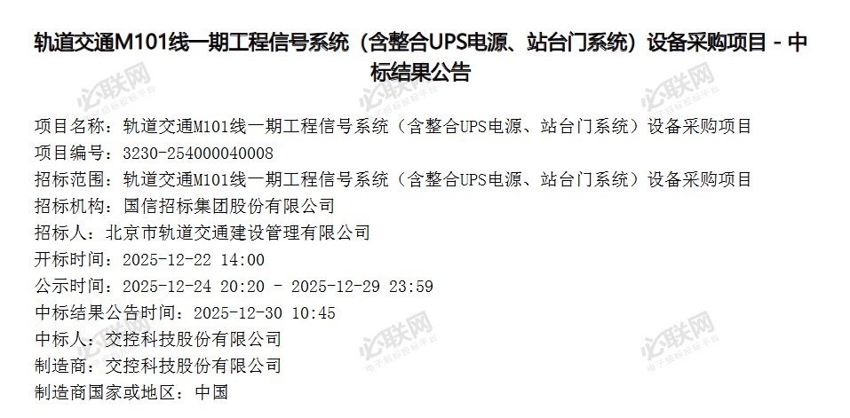 小编还了解,不久前,相关网站还发布了“轨道交通M101线一期工程信号系统(含整合UPS电源、站台门系统)设备采购项目中标结果公告”。