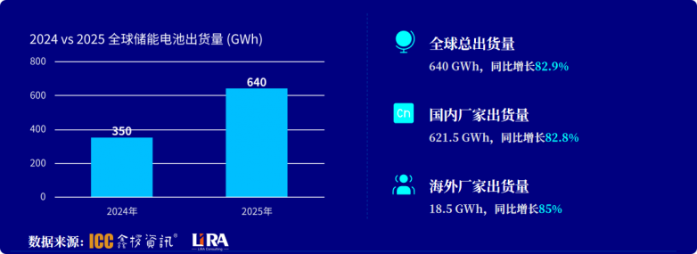 2025年全球储能电池出货640GWh,同比增长82.9%。
