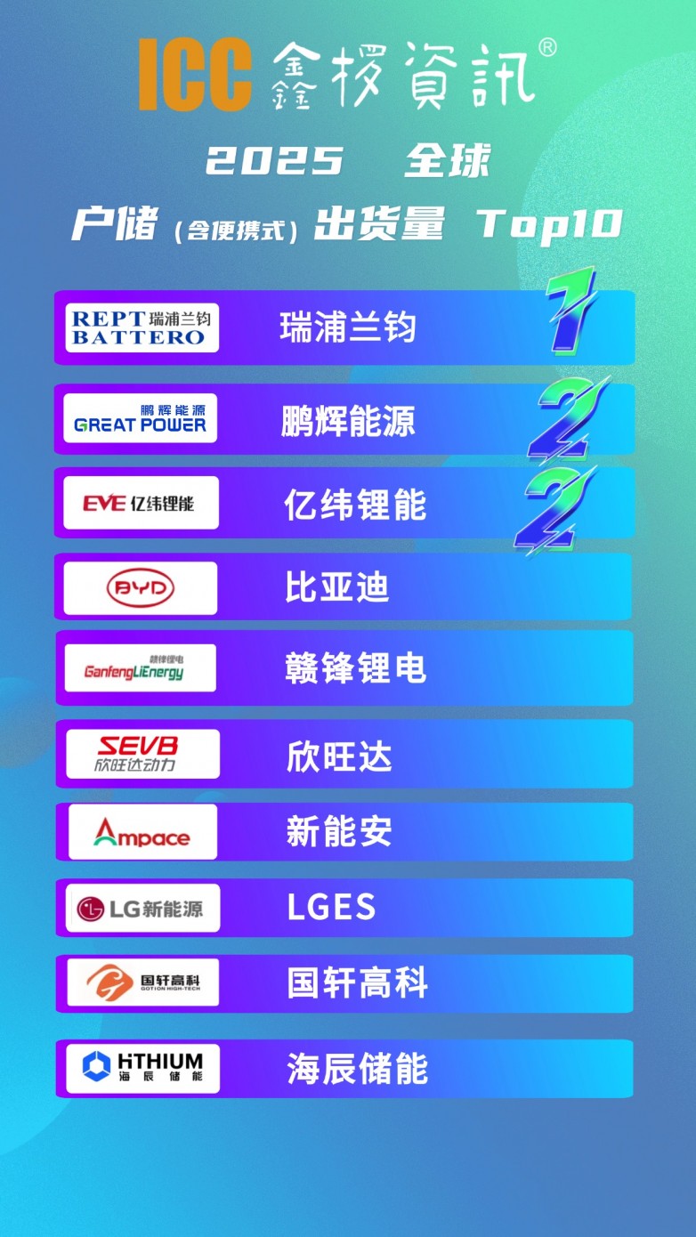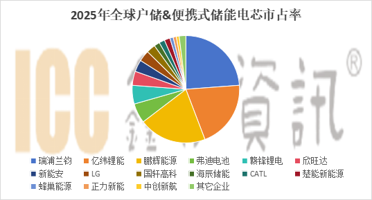 户储&便携式:2025年户储&便携式电池出货58.8GWh,同比增长117.7%,户用&便携式储能领域已经形成三巨头的市场竞争发展格局。瑞浦兰钧、亿纬锂能、鹏辉能源市占率均超20%,其余电池厂家市占率在8%以下。