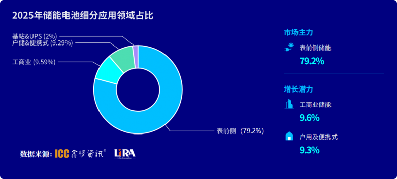 储能细分应用领域方面,2025年表前侧储能市场占比79.2%,工商业储能市场占比9.6%,户储&便携式储能市场占比9.3%,基站&数据中心备电市场占比2%。