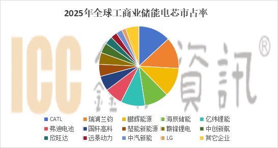 工商业侧:2025年工商业侧储能电池出货61GWh,同比增长103%,工商业储能电池市场已经形成五巨头的市场竞争格局。宁德时代依靠特斯拉、为恒智能、四象新能源、协鑫能科、中车株洲所、海博思创等头部系统集成厂商及旗下合资集成企业,市占率稳居第一,占13%以上,瑞浦兰钧、鹏辉能源、海辰储能、亿纬锂能占比10%-13%之间,紧随其后,其余厂家占比在10%以下。