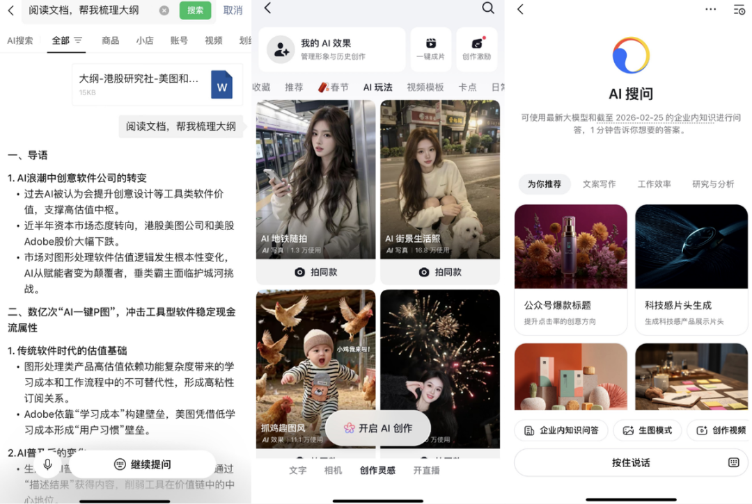 Adobe和美图,困境的根源就在这里。只通过AI实现单点功能优化的软件产品,即使在短期内具备用户增长弹性,但由于缺乏业务闭环,长期价值更接近可替代工具,很难再支撑持续扩张的估值中枢。