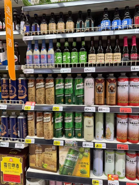 货架上,同规格的“雪花精酿全麦啤酒”“金星蜜桃乌龙”售价分别为24.9元、20.9元,消费者几乎只需一半的价格就能买到乌苏啤酒,其售价与超市自有品牌的1升啤酒相差不大。