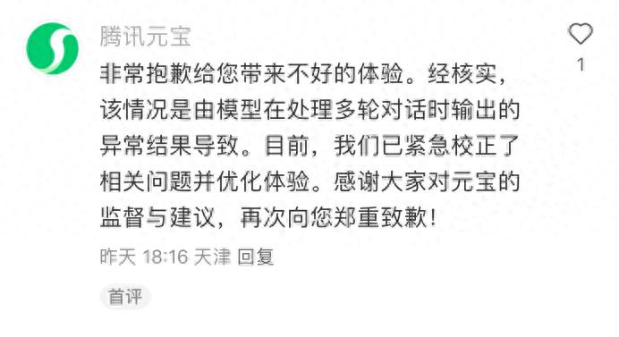 《科创板日报》记者注意到,针对此事,腾讯元宝官方迅速在向律师相关帖子的评论区作出回应,致歉称该情况为模型在处理多轮对话时输出异常导致,目前已紧急校正相关问题并优化体验。