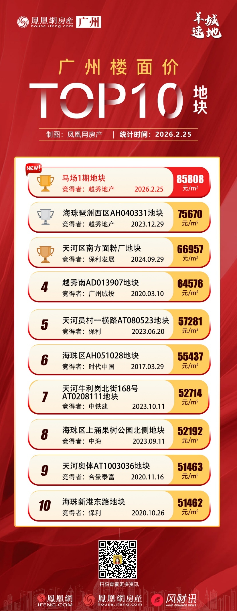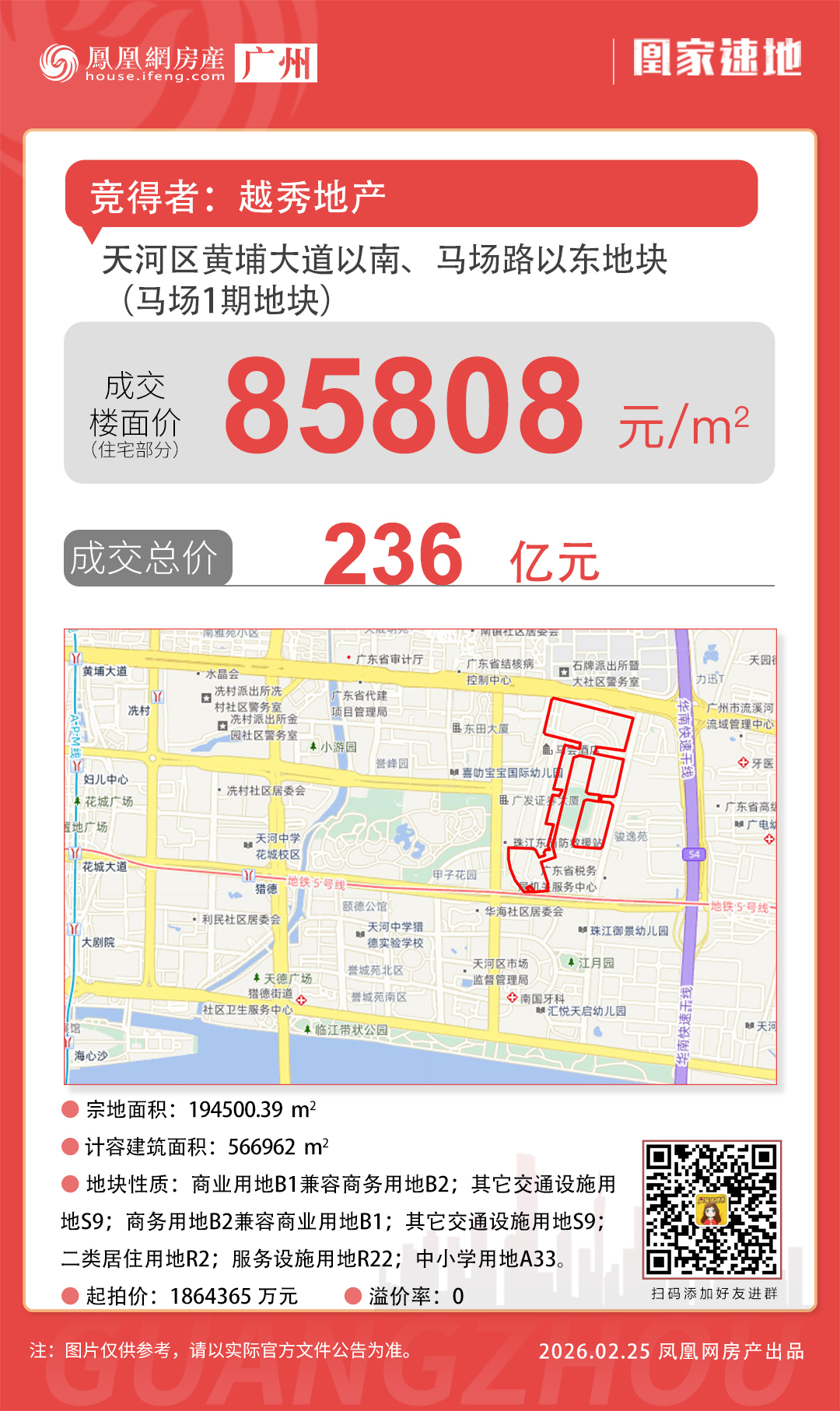 2月25日10时,天河区黄埔大道以南、马场路以东地块(马场1期地块)限时竞拍,经过10.5小时,243轮竞拍,最终由广州越诚达有限公司,归属越秀地产,以总价236亿元竞得,按商业部分恒定为18196元/平计算,扣除配建后,折合住宅楼面价为85808元/平。