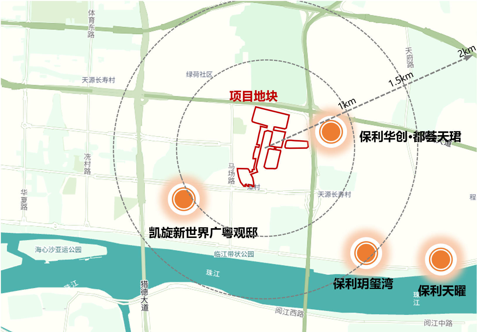 周边在售项目包括有凯旋新世界广粤观邸、保利华创·都荟天珺、保利玥玺湾、保利天曜等豪宅项目。