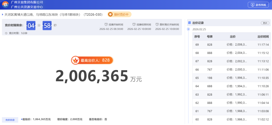 11点,竞价已经来到第59轮,广州城投出价超198.4亿元。