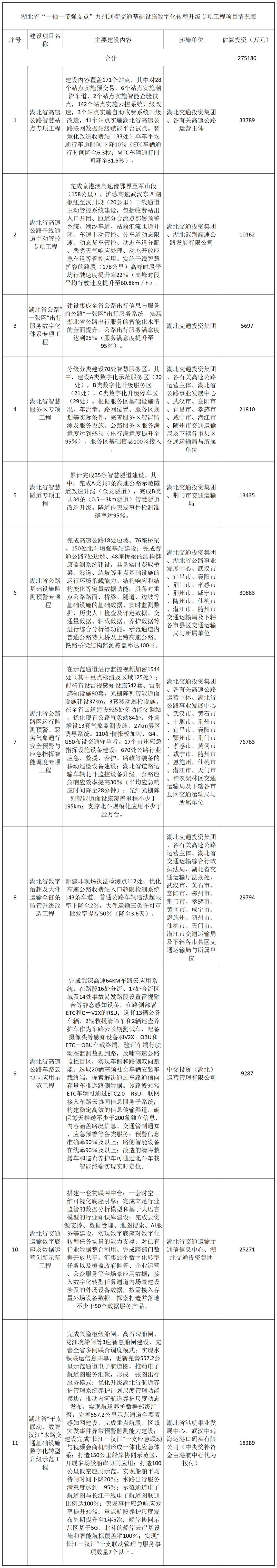 1月底,湖北省发改委公开批复湖北省“一轴一带强支点”九州通衢交通基础设施数字化转型升级专项工程的可研报告,项目投资预算为27.5亿,项目覆盖1808公里国家高速公路和930公里普通国道以及557公里的航道。具体如下: