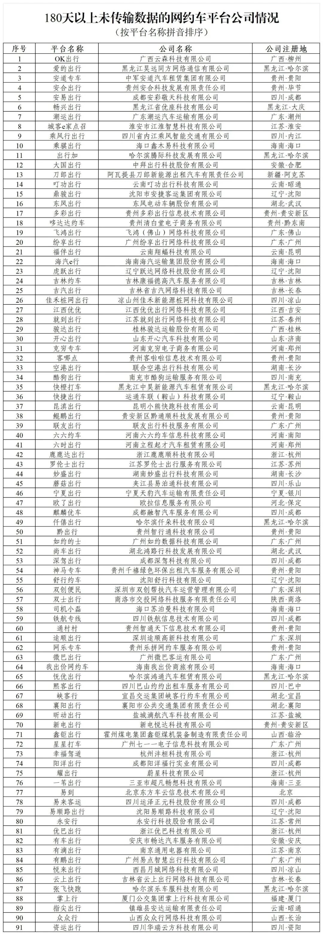 另外,交通运输部还披露了180天以上未传输数据的网约车平台公司,分别是:OK出行、爱的出行、安道专车、安合出行、安易出行、畅兴出行、潮运出行、城客 e 家点召、乘风出行、乘骐出行、出行加、大国出行、刀郎出行、叮功出行、鼎骏出行、东风出行、多彩出行、哆达达约车、飞鸿出行、纷享出行、福伴出行、海汽 e 行、虎跃出行、吉林约车、吉汽出行、佳禾桩网出行、江西优优、就到出行、骏达出行、开心出行、克穷专车、客哪点、空港出行、酷狗出行、快橙打车、快捷出行、昆滇出行、鲲鹏出行、联友出行、六六约车、六时出行、鹿鹿达出行、罗伦士出行、妙盛出行、蘑菇出行、宁夏出行、欧了出行、麒麟优车、仟僖出行、黔出行、如约的士、尚车出行、深驾出行、神马专车、舒行约车、双创便民、双士出行、司机小磊、铁航专线、通村村、途顺出行、网乐专车、微巴出行、我出价网约车、优优出行、熙客出行、峡客行、襄阳出行、昕动出行、新电出行、鑫钜出行、星星打车、幸福驾道、阳洋出行、耀出行、一苇出行、易到、易来客运、易顺路出行、永安行、优巴出行、有车出行、有滴出行、有鹏出行、悦来出行、云上出行、张飞快跑、掌上行、指尖出行、众众行、资运出行。