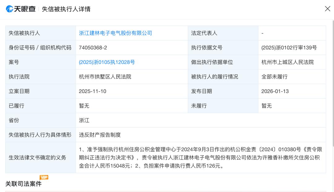 并且,建林电气历史上12次成为被执行人,6次被列为限制高消费企业。2026年1月,建林电气因补缴所欠住房公积金合计1.5万元,再次成为失信被执行人。