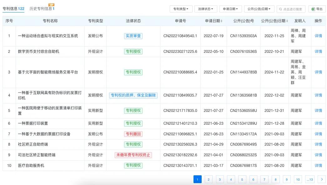 建林电气共有192项专利信息,发明人大多数均为周建军。专利涉及元宇宙、货币支付、发票等,涉及行业包括医院、银行等。