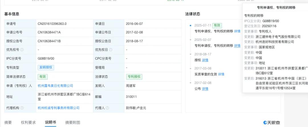 这项“电子狗”专利最初为浙江建林电子电气股份有限公司(下称“建林电气”)持有。2025年2月7日,建林电气将该专利转让给杭州连好科技贸易有限公司,7月11日,连好科技又转让给如今的露韦美。