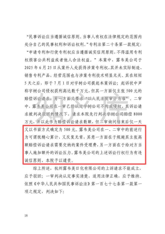 最高人民法院在二审中指出,露韦美公司于2025年6月25日获得专利后未实际制造、销售专利产品,经营范围与专利技术无关,在短短5天之后,即向宇树科技提起诉讼。其在一审中主张500元赔偿却要求审计,二审中先提出8000万元赔偿并申请先行赔付,次日又调回500元,行为“既精心算计、又反复无常”,实则是为规避诉讼费、向宇树科技施加额外诉讼压力,该行为违反诚信原则,法院予以谴责。