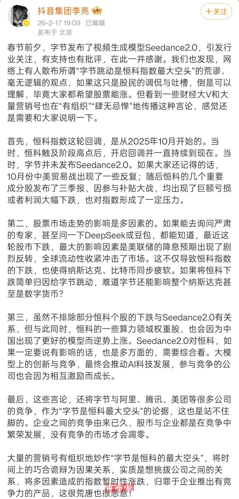 对此,抖音集团副总裁李亮在个人微博发布澄清声明,驳斥网络传言荒谬恶意,强调股市受多重因素影响,不能将恒科下跌归咎于字节跳动。