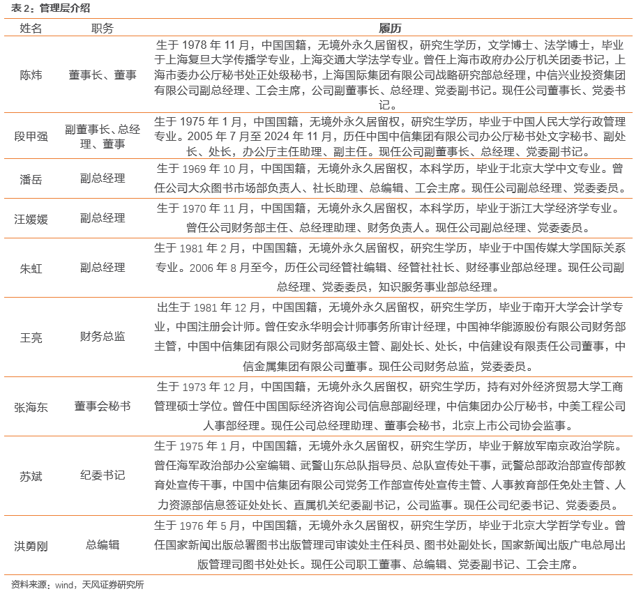 管理层看,高管团队经验丰富,在相关行业有多年任职经历,专业知识丰富;且大部分管理层均在公司或者中信集团体系内任职多年,企业文化认同感强。