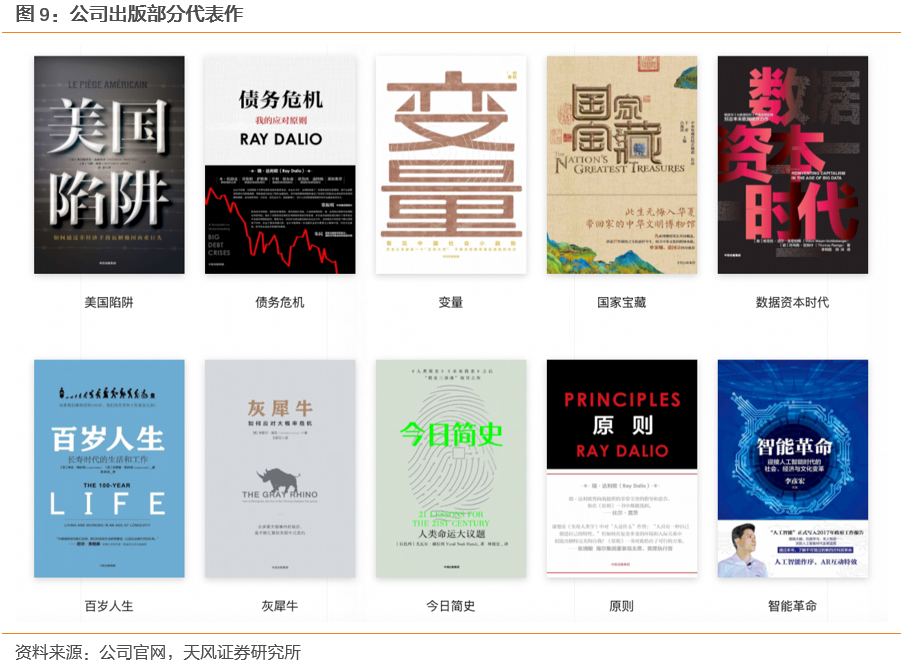 总实力突出:根据开卷报告,公司零售市场市占率常年靠前,其中24-25H1均位列全国图书零售市场单体出版社首位。旗下拥有见识城邦、前沿、灰犀牛、中信大方等知名出版社/品牌,曾与超13,000位国内外作者建立合作,出版图书超过12,000种,基本实现了大众出版领域的全覆盖,曾出版了《谁动了我的奶酪》、《从优秀到卓越》、《激荡三十年》、《黑天鹅》、《人类简史》等经典书籍。