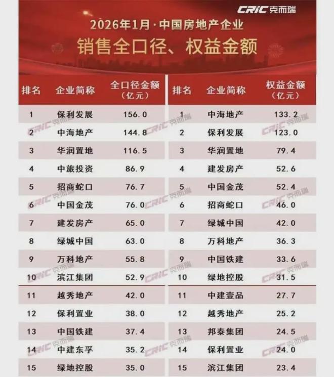 参考克而瑞数据,2025年全年,按全口径销售额看,千亿房企一共10家,分别是保利(2530亿元)、中海(2512亿元)、华润(2326亿元)、招商蛇口(1960亿元)、绿城(1534亿元)、万科(1339亿元)、建发(1220.8亿元)、金茂(1135亿元)、越秀(1082亿元)与滨江(1017.6亿元)。