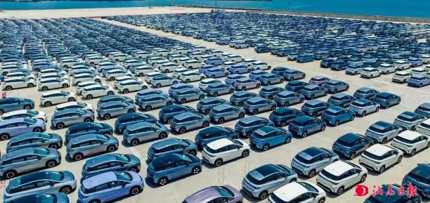 小漠国际物流港待出口的新能源汽车。