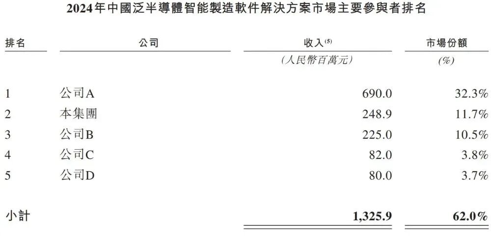 根据弗若斯特沙利文(Frost & Sullivan)报告,按智能制造软件解决方案产生的收入计,于2024年,公司在中国泛半导体智能制造软件市场的国内泛半导体智能制造软件解决方案提供商中排名首位。