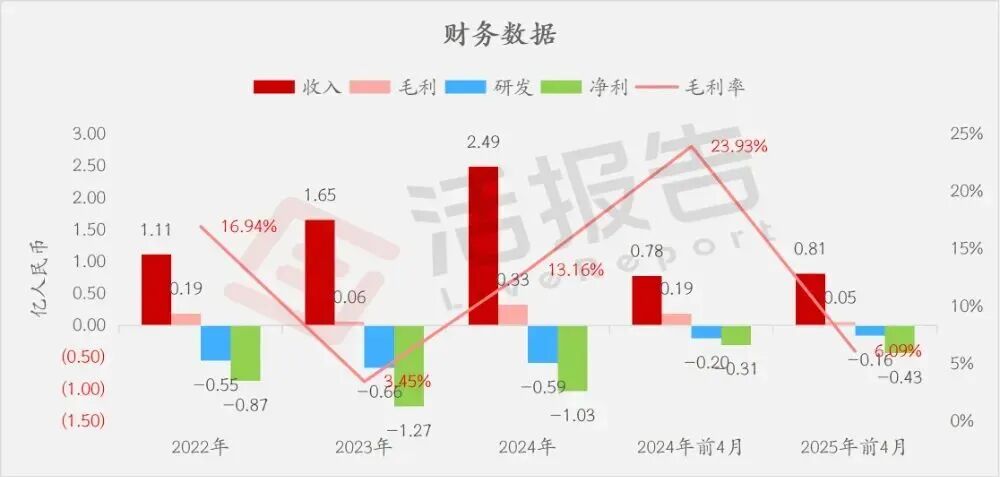收入分别约为人民币1.11亿、1.65亿、2.49亿、0.78亿、0.81亿,2025年前4月同比+4.23%;
