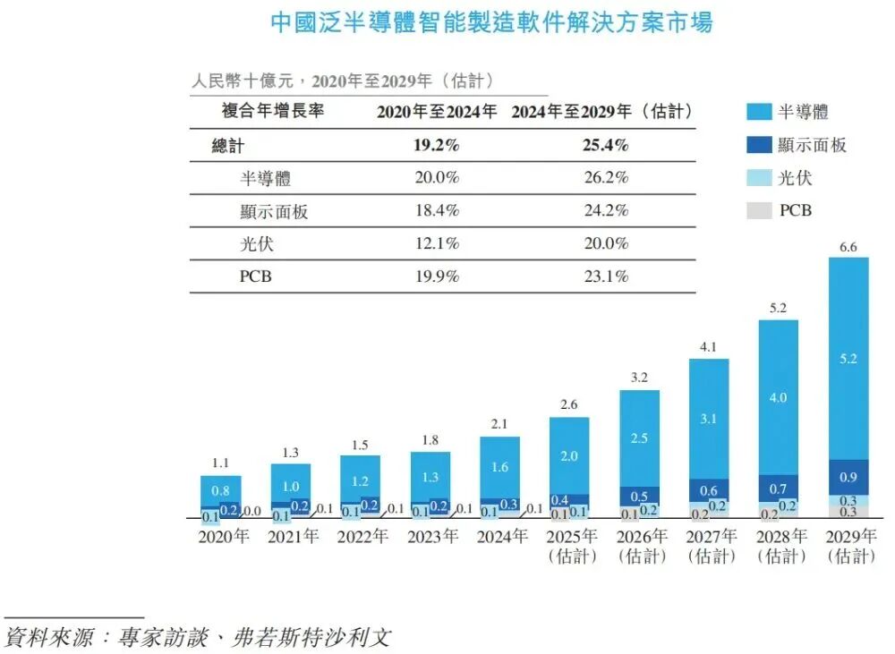 根据弗若斯特沙利文(Frost & Sullivan)报告,按销售收入计,中国泛半导体智能制造软件解决方案市场有望实现大幅增长,预计整体市场规模将由2020年的人民币11亿元增至2029年的人民币66亿元,2024年至2029年的复合年增长率为25.4%。