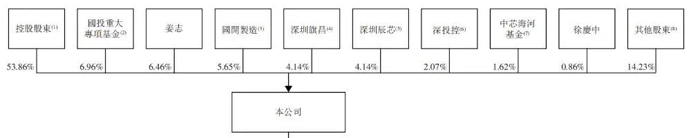 国资委旗下的国投重大专项基金持股约6.96%;姜志持股约6.46%;国家开发银行旗下的国开制造持股约5.65%;国资委所控制的深圳辰芯持股约4.14%;招商局资本旗下的深圳旗昌持股约4.14%;深圳市国资委旗下的深投控持股约2.07%;中芯国际(688981.SH、0981.HK)的中芯海河基金持股约1.62%;徐庆中持股约0.86%;其他股东合计持股约14.23%。