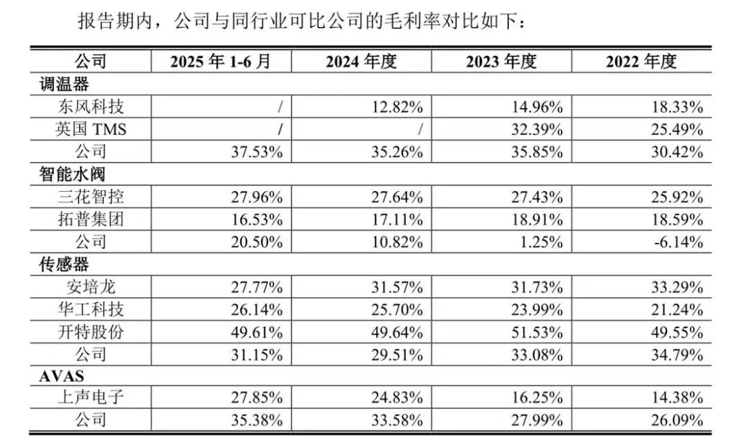 而与之可比公司三花智控的智能水阀产品各期毛利率分别为25.92%、27.43%、27.64%、27.96%;拓普集团智能水阀产品各期毛利率分别为18.59%、18.91%、17.11%、16.53%。