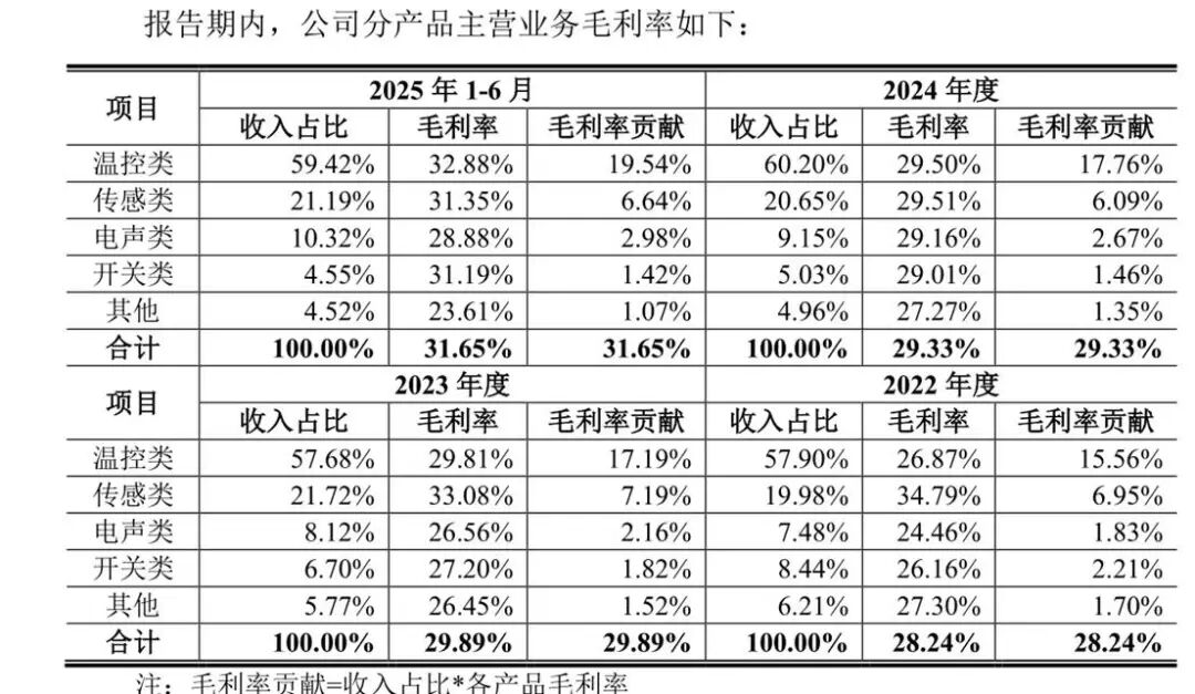 分产品看,天博智能核心收入来源温控类产品各期毛利率分别为26.87%、29.81%、29.50%、32.88%,第二大收入来源传感类产品各期毛利率分别为34.79%、33.08%、29.51%及31.35%。